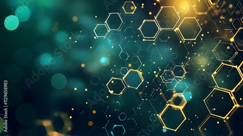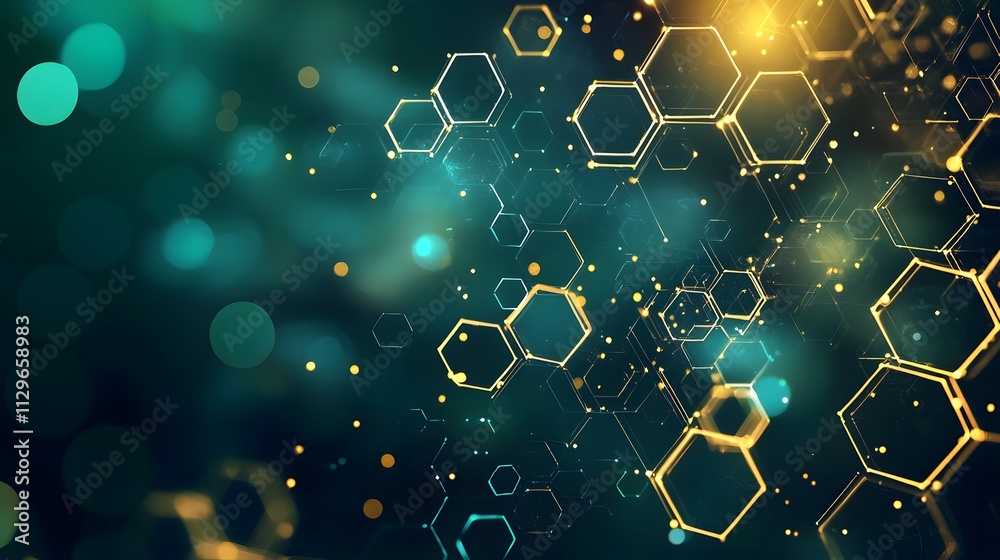 The watermark will not be included on Canvas Print.: Abstract golden hexagonal grid glowing with soft light and floating bokeh elements on a deep green b