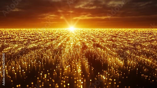 The watermark will not be included on Canvas Print.: Abstract golden light illuminating an endless field of sparkling dots under a dramatic sunset sky, c