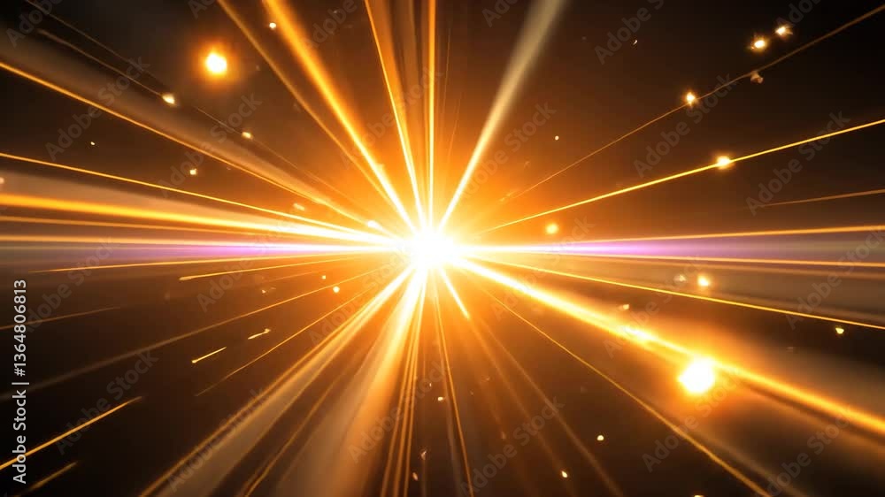 The watermark will not be included on Canvas Print.: Abstract golden light rays bursting from central bright point with sparkling particles on black back