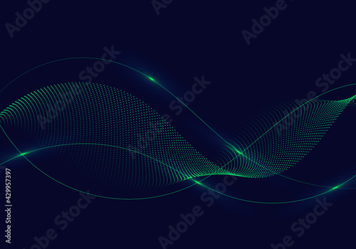 Canvas Prints abstract green wavy lines with dots particles and lighting on dark blue background.