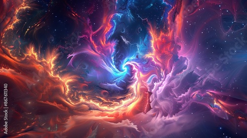 The watermark will not be included on Canvas Print.: Abstract neon fractal wallpaper with vibrant space elements and galactic patterns in a dark cosmic b