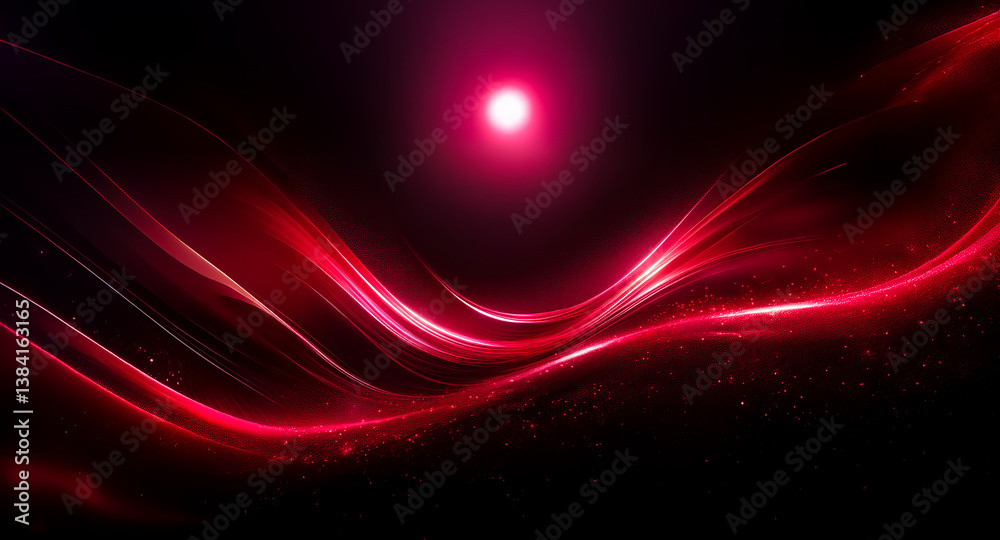 The watermark will not be included on Canvas Print.: Abstract red light illuminates dark waves - luminous lines curve across the deep black background, cr