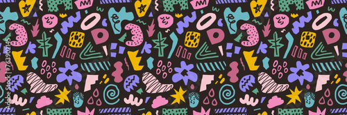 The watermark will not be included on Canvas Print.: Abstract seamless pattern of colorful hand drawn various shapes, curls, forms and doodle objects - mo