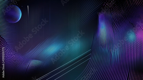 The watermark will not be included on Canvas Print.: Abstract waves flow upward around glowing orbs with linear patterned digital dark blue-purple gradie
