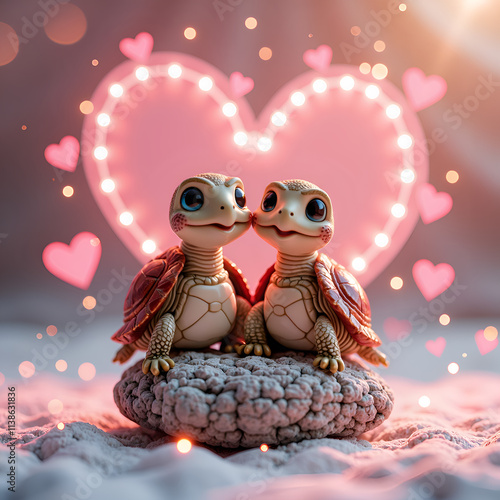 The watermark will not be included on Canvas Print.: Adorable turtle companions surrounded by a heartwarming glow and playful hearts, 3d rendering of cut