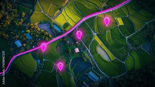 Canvas Prints aerial shot of a landscape with neon lit pins or pointers on top of it, global positioning system or