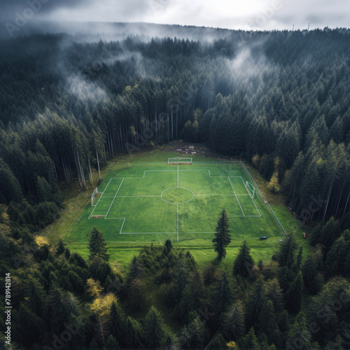 The watermark will not be included on Canvas Print.: Aerial view of a football field in the forest during a cloudy day -