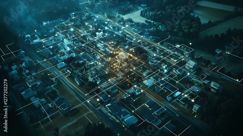 The watermark will not be included on Canvas Print.: Aerial view of a small town with digital network lines showcasing connectivity and innovation in rur