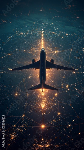 Canvas Prints aerial view of an airplane soaring over a vast, illuminated network of golden lights, symbolizing th
