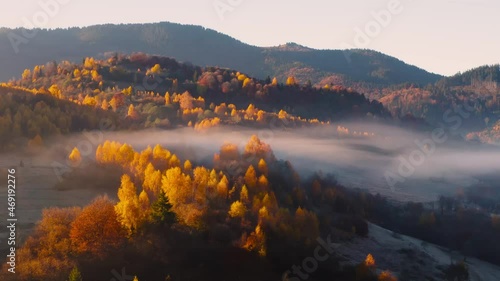 Canvas Prints aerial view of mountain forest in low clouds at sunrise in autumn. hills with red and orange trees i