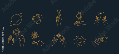 The watermark will not be included on Canvas Print.: Aesthetic hands and cosmic and celestial elements - universal cosmos related icons - linear vector ill