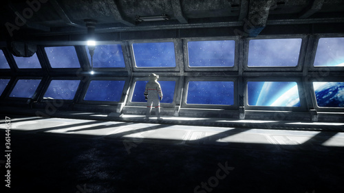 The watermark will not be included on Canvas Print.: Alone astronaut in futuristic space corridor, room - view of the earth - 3d rendering -