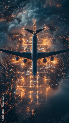 The watermark will not be included on Canvas Print.: An airplane over a city grid, surrounded by glowing lights and abstract patterns, blending technolog