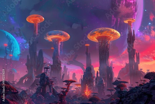 The watermark will not be included on Canvas Print.: An alien landscape with towering structures and glowing mushrooms