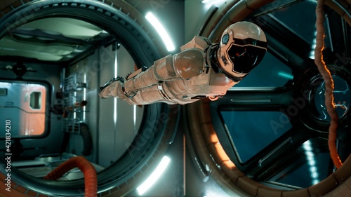 Canvas Prints an astronaut in zero gravity checks the module of his spaceship. 3d rendering.