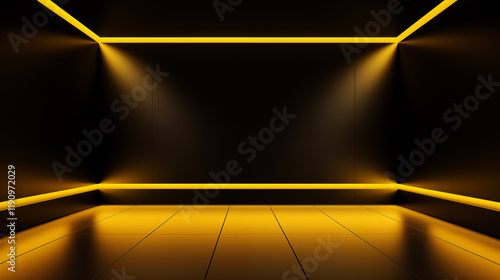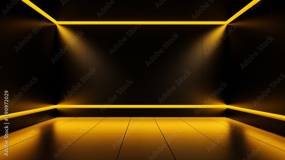 The watermark will not be included on Canvas Print.: An empty room with a futuristic and dark design decorated with yellow neon -