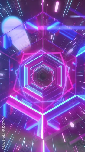 The watermark will not be included on Canvas Print.: Animation of neon shapes moving over digital tunnel