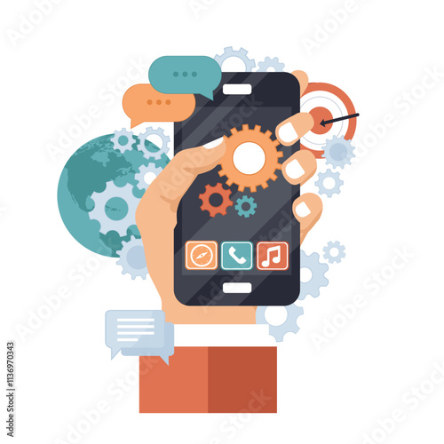 The watermark will not be included on Canvas Print.: Application development icon - concept to building successful business - mobile phone and gears on the