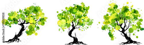 The watermark will not be included on Canvas Print.: Artistic trees with green paint splashes leaves - hand drawn isolated design elements with ink textur