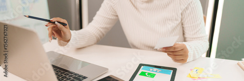 Canvas Prints asian woman's hand creating ui designs on laptop and tablet for mobile app development focus on ux d