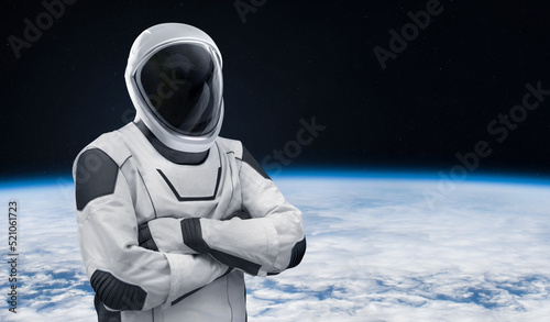 Canvas Prints astronaut in modern new spacesuit in space near earth. space collage with spacex spaceman. elements