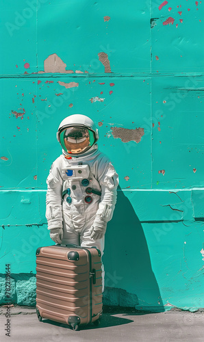 The watermark will not be included on Canvas Print.: Astronaut in spacesuit and with baggage suitcase, space exploration and discovery concept, travel an