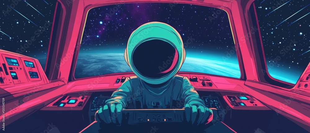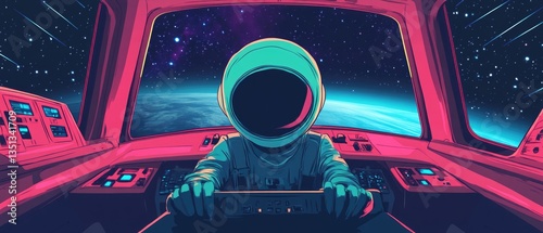 The watermark will not be included on Canvas Print.: Astronaut sits in a spacecraft with equipment and controls