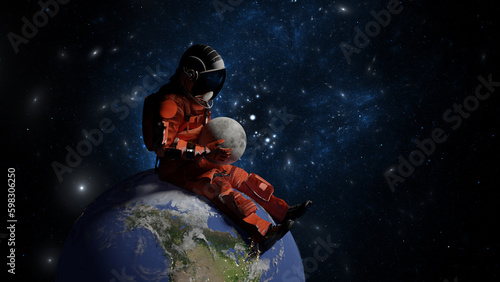 Canvas Prints astronaut sits on planet earth and hold moon in hands. cosmonaut in space, exploration of outer spac