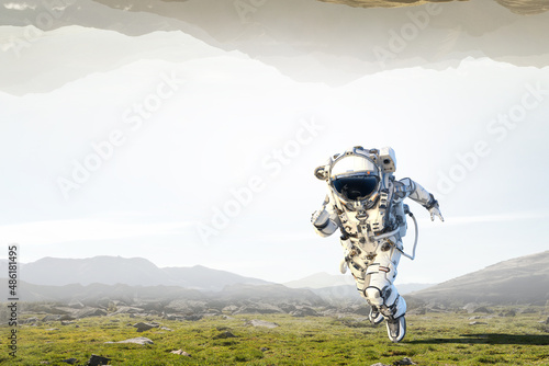 The watermark will not be included on Canvas Print.: Astronaut walking on an unexplored planet