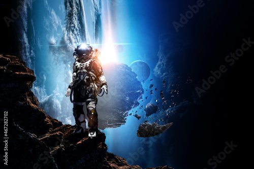 The watermark will not be included on Canvas Print.: Astronaut walking on an unexplored planet