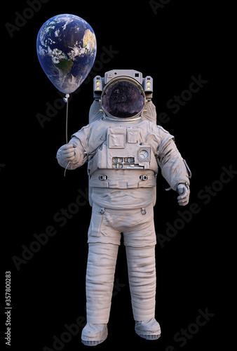 The watermark will not be included on Canvas Print.: Astronaut with planet earth balloon isolated on black background