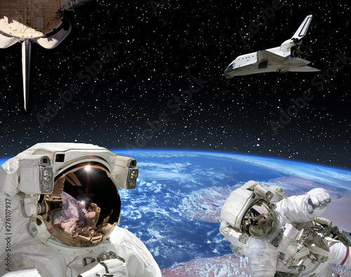 The watermark will not be included on Canvas Print.: Astronauts and spaceships against earth - the elements of this image furnished by nasa -