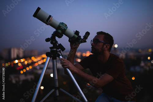 The watermark will not be included on Canvas Print.: Astronomer with a telescope watching at the stars and moon with blurred city lights in the backgroun