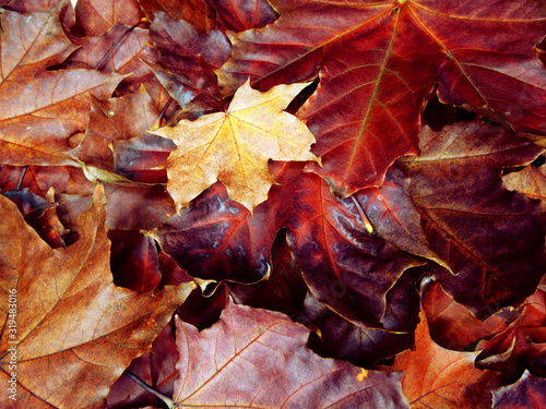 The watermark will not be included on Canvas Print.: Autumn background forest with maple trees and sunny beams