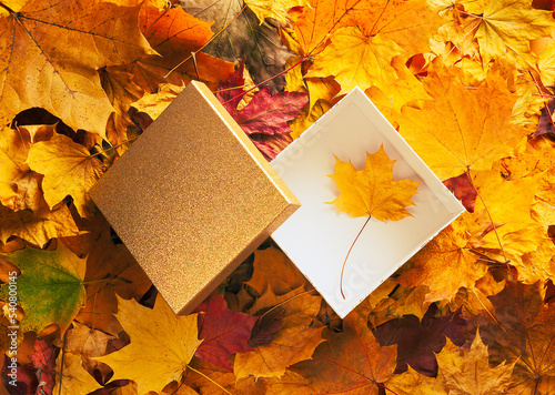 Canvas Prints autumn concept - background of dry fallen autumn leaves with an open gift box in the middle. the box