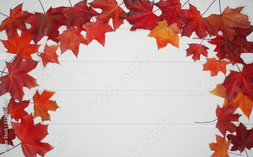 The watermark will not be included on Canvas Print.: Autumn forest with maple trees on wooden background