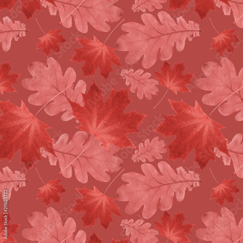 The watermark will not be included on Canvas Print.: Autumn pattern from dry oak leaves and dry maple leaves on a red background