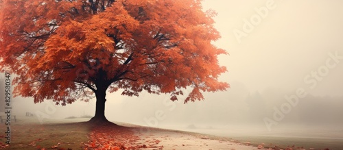 The watermark will not be included on Canvas Print.: Autumnal tree with colorful leaves lining a dusty pathway a serene scene for a peaceful stroll with