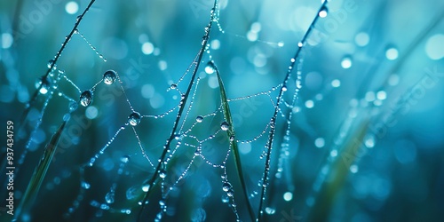 The watermark will not be included on Canvas Print.: Beautiful natural background with necklace of water droplets on a cobweb in grass in spring of summe