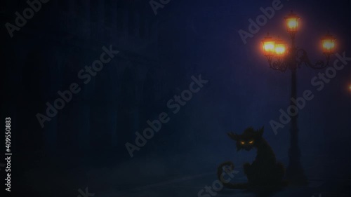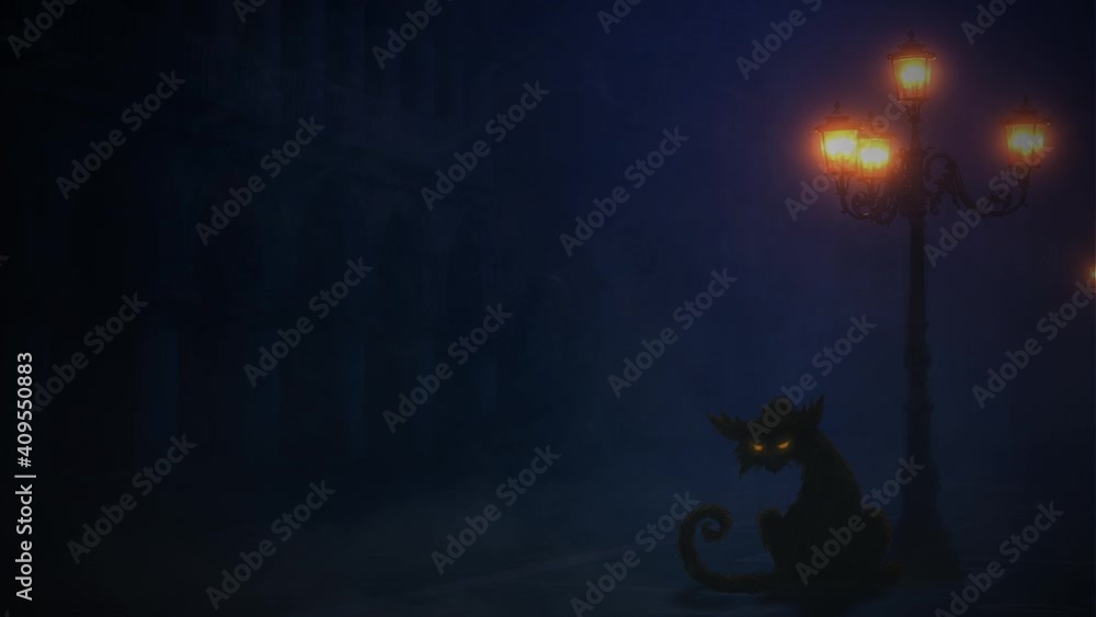 The watermark will not be included on Canvas Print.: Black alley cat by a lamp post 4k loop features a black cat with blinking yellow eyes sitting under
