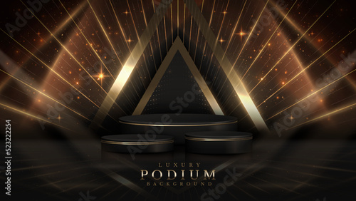 The watermark will not be included on Canvas Print.: Black luxury background with product display podium and golden line elements and light rays decorati