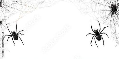 The watermark will not be included on Canvas Print.: Black spider web with two small spiders hanging from the edges spooky halloween border design for an