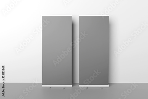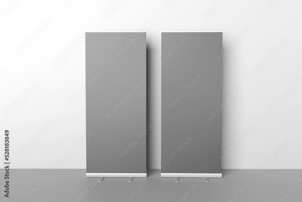 Canvas Print : Blank gray roll-up banner display mockup on light background, isolated, 3d rendering