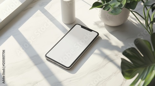 Canvas Print : Blank mockup template of a modern smartphone placed on a light neutral surface, surrounded by clean