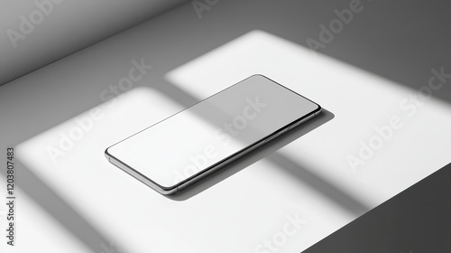 The watermark will not be included on Canvas Print.: Blank mockup template of a slim smartphone on a light gray surface, with soft shadows and minimalist