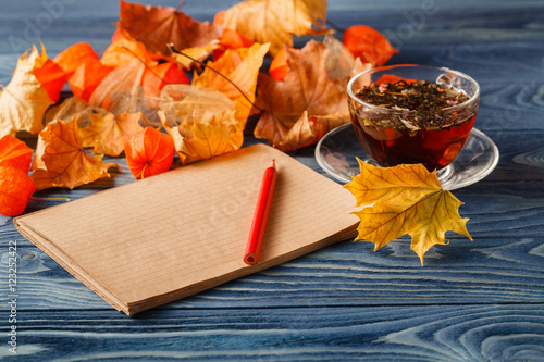 Canvas Prints blank notepad and colorful autumn maple leaves on wooden table b