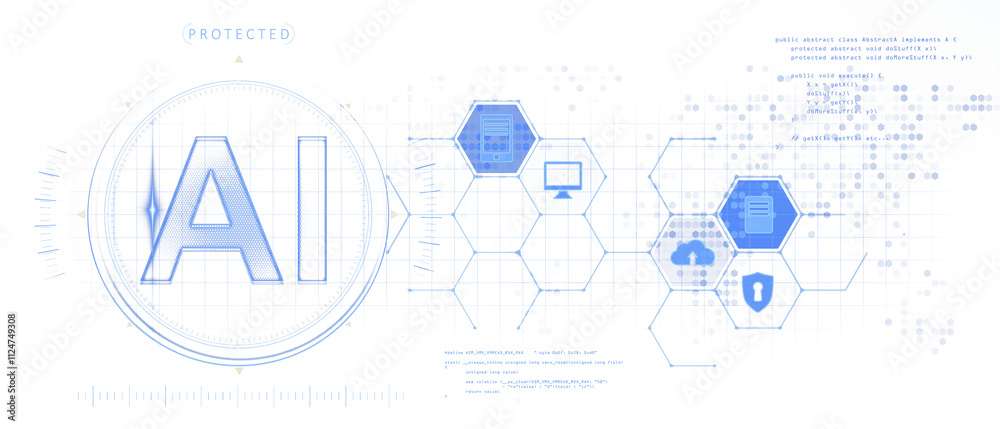 The watermark will not be included on Canvas Print.: Blue ai text and digital icons within hexagonal elements on a white background, styled with holograp