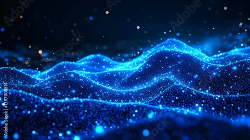 The watermark will not be included on Canvas Print.: Blue digital mountain landscape with glowing data points in motion