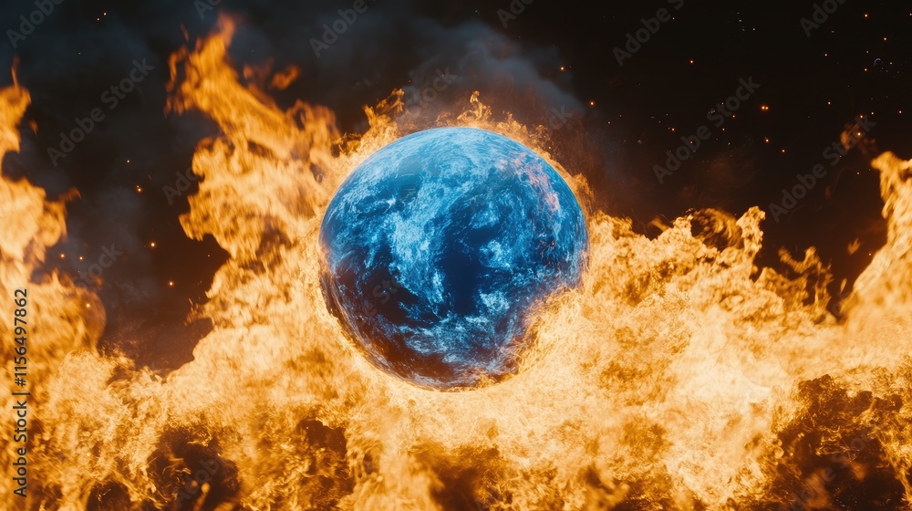 The watermark will not be included on Canvas Print.: Blue planet engulfed in flames with dramatic fire background and ample empty space for text placemen