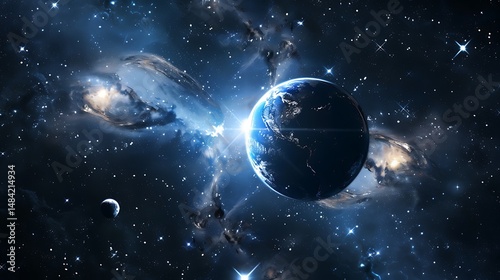 Canvas Print : Blue planet surrounded by stars and nebulae in the dark outer space background